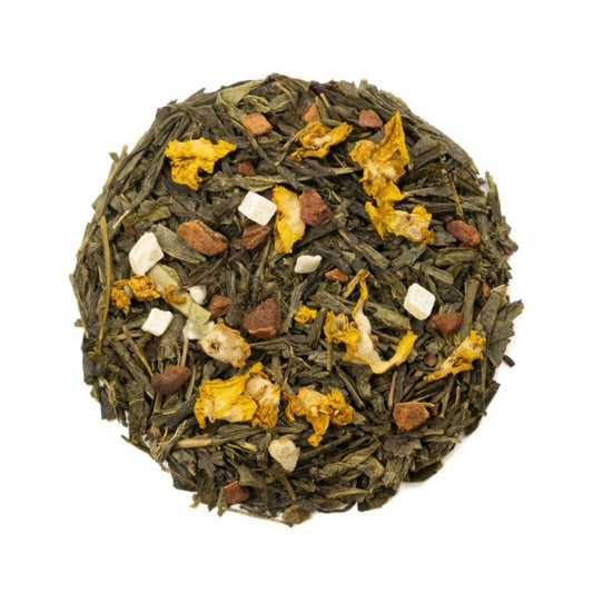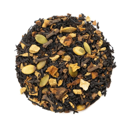 Thé noir, cannelle, gingembre, morceaux de citrouille