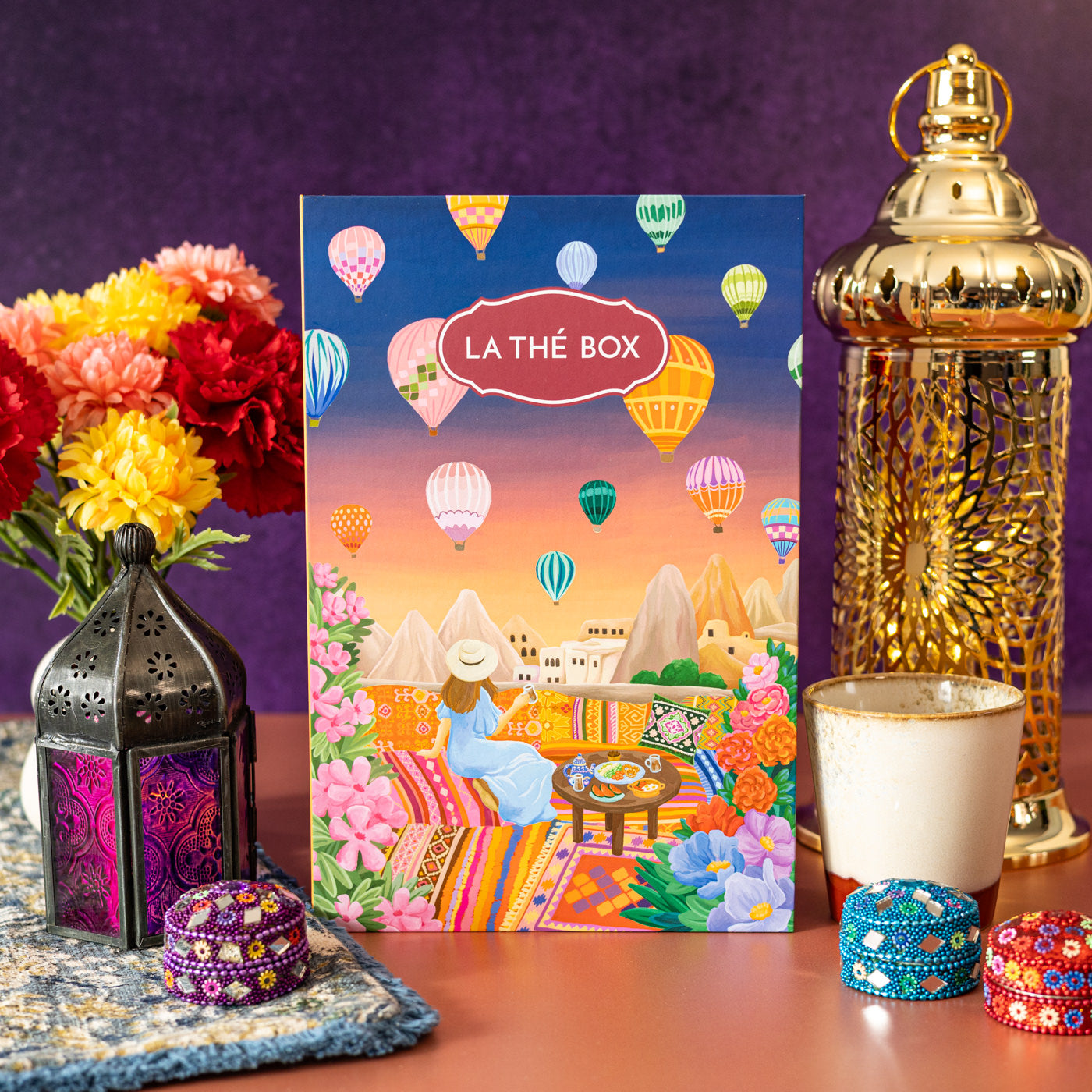 Un matin suspendu au-dessus du monde... La Thé Box vous emmène au cœur de la Cappadoce, là où les montgolfières effleurent les nuages au lever du soleil.