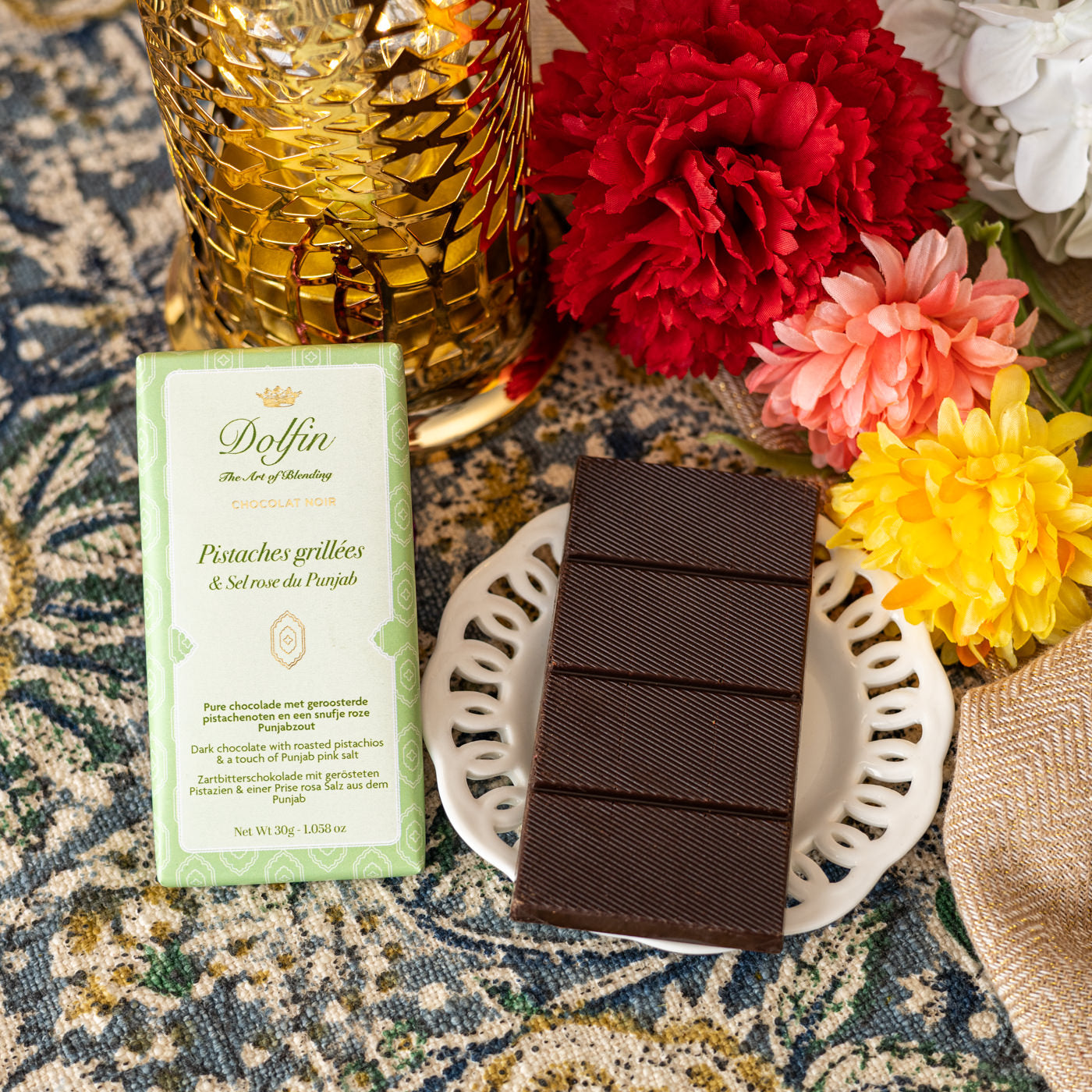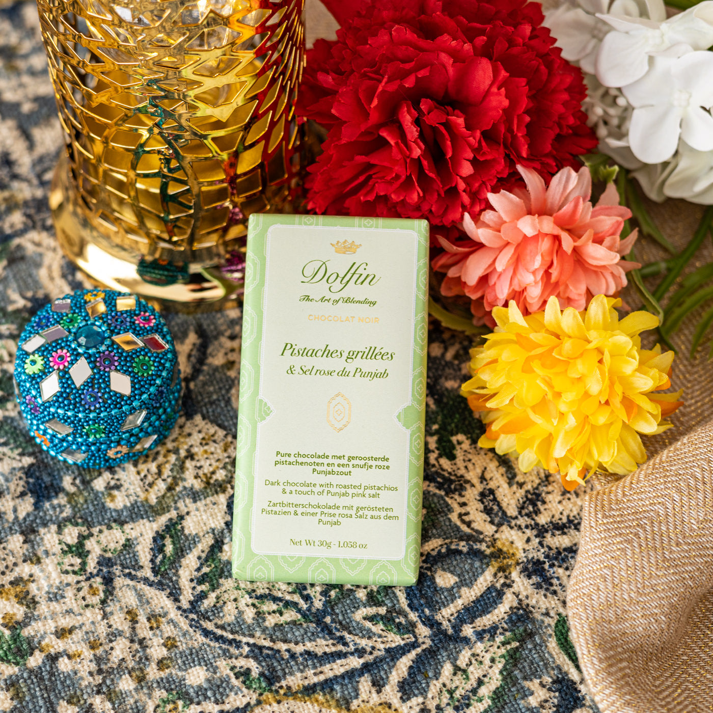 de DolfinUn mariage entre le chocolat noir intense, la pistache croquante et une touche délicate de sel rose du Punjab, pour une pause thé gourmande.