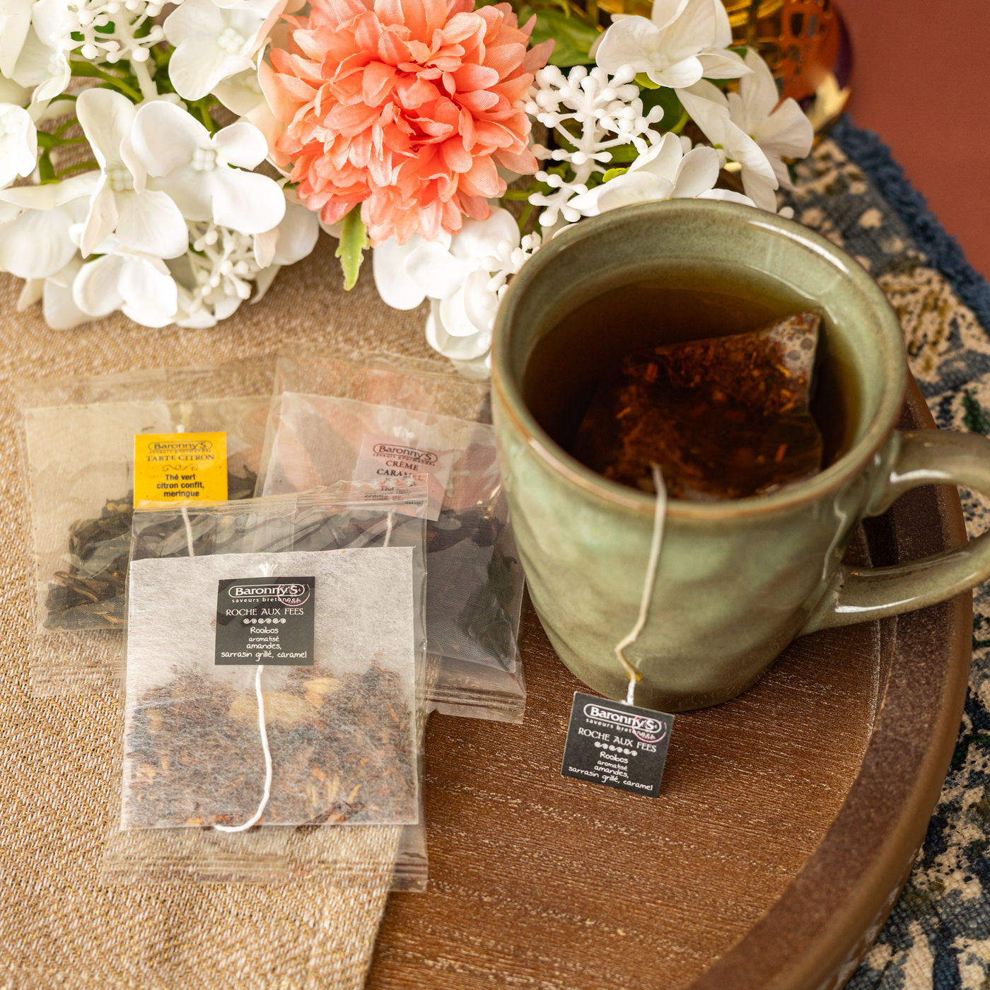 - Rooibos Pays de la Roche aux Fées de Baronny's (2 infusettes) : Rooibos (53 %), amandes (10 %), cacao, crispies de yaourt (contient du lait) (5 %), dés de caramel (contient du lait), sarrasin grillé (4 %), grain de malt, arôme.