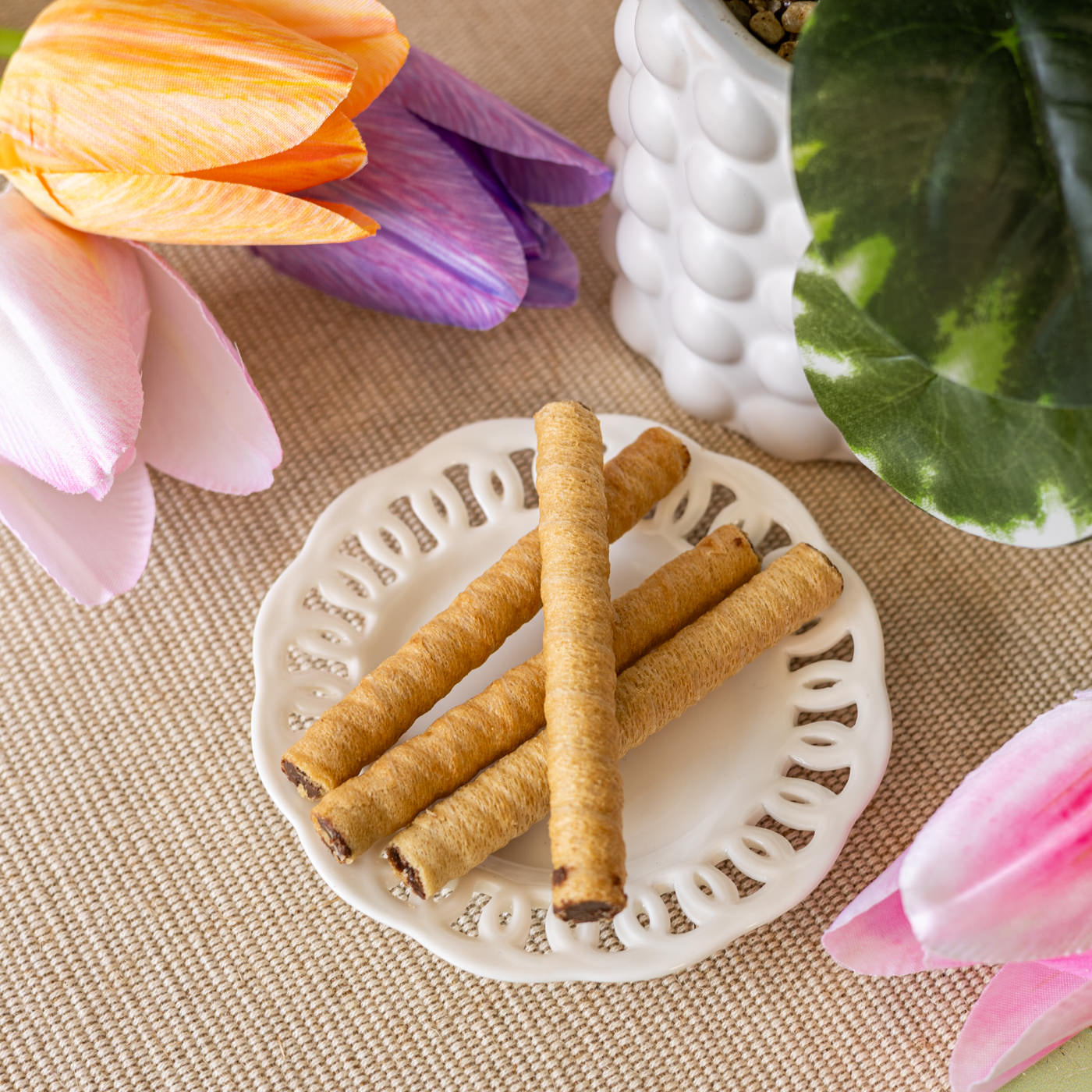 de Maxim'sUne flûte feuilletée au chocolat noisette, légère et gourmande, parfaite pour une pause de thé.