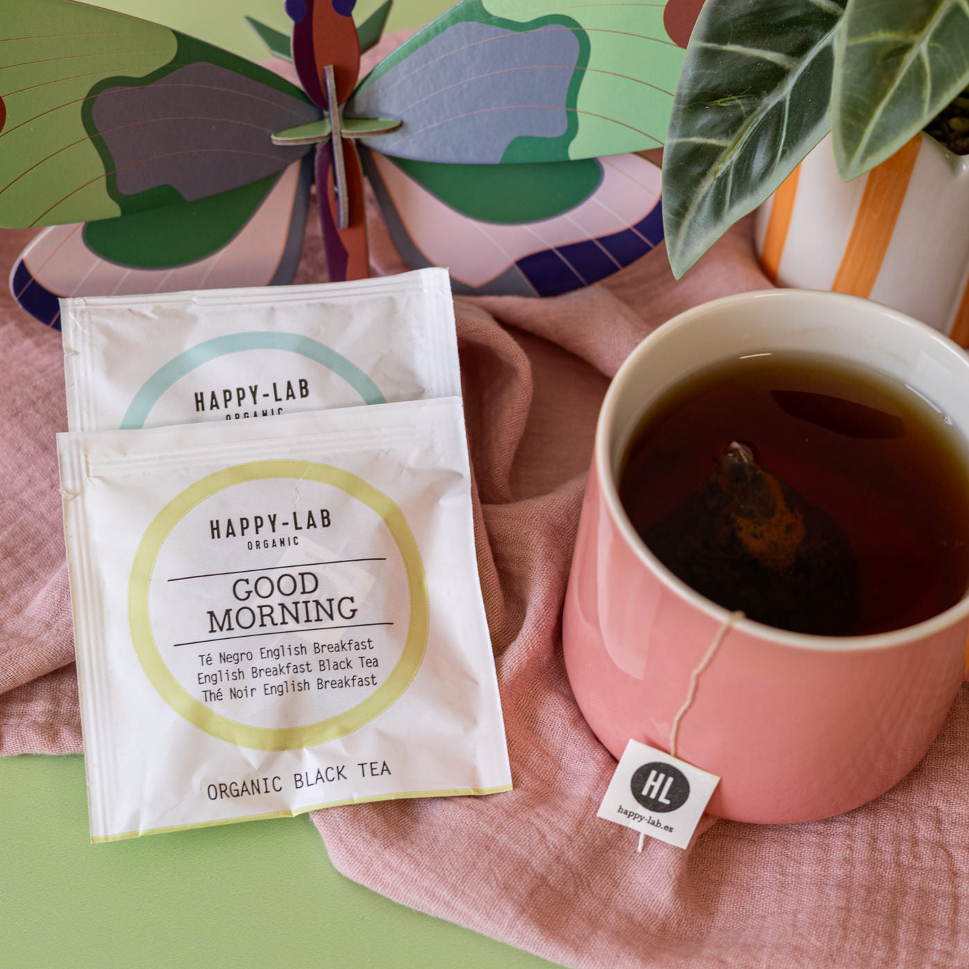 - Good Morning de Happy-Lab (2 infusettes) : Thé noir assam (80 %) et thé noir orange pekoe (20 %).
