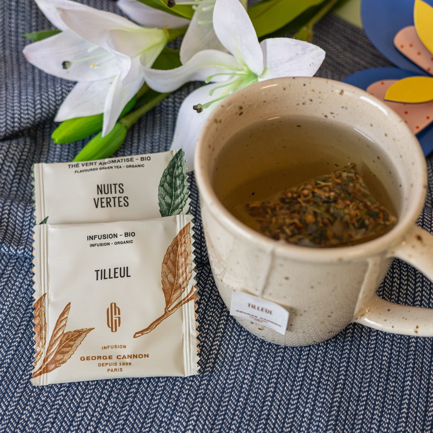 2 infusettesTilleul, une infusion délicatement miellée qui évoque la douceur des soirs d’enfance et offre un moment de calme apaisant.