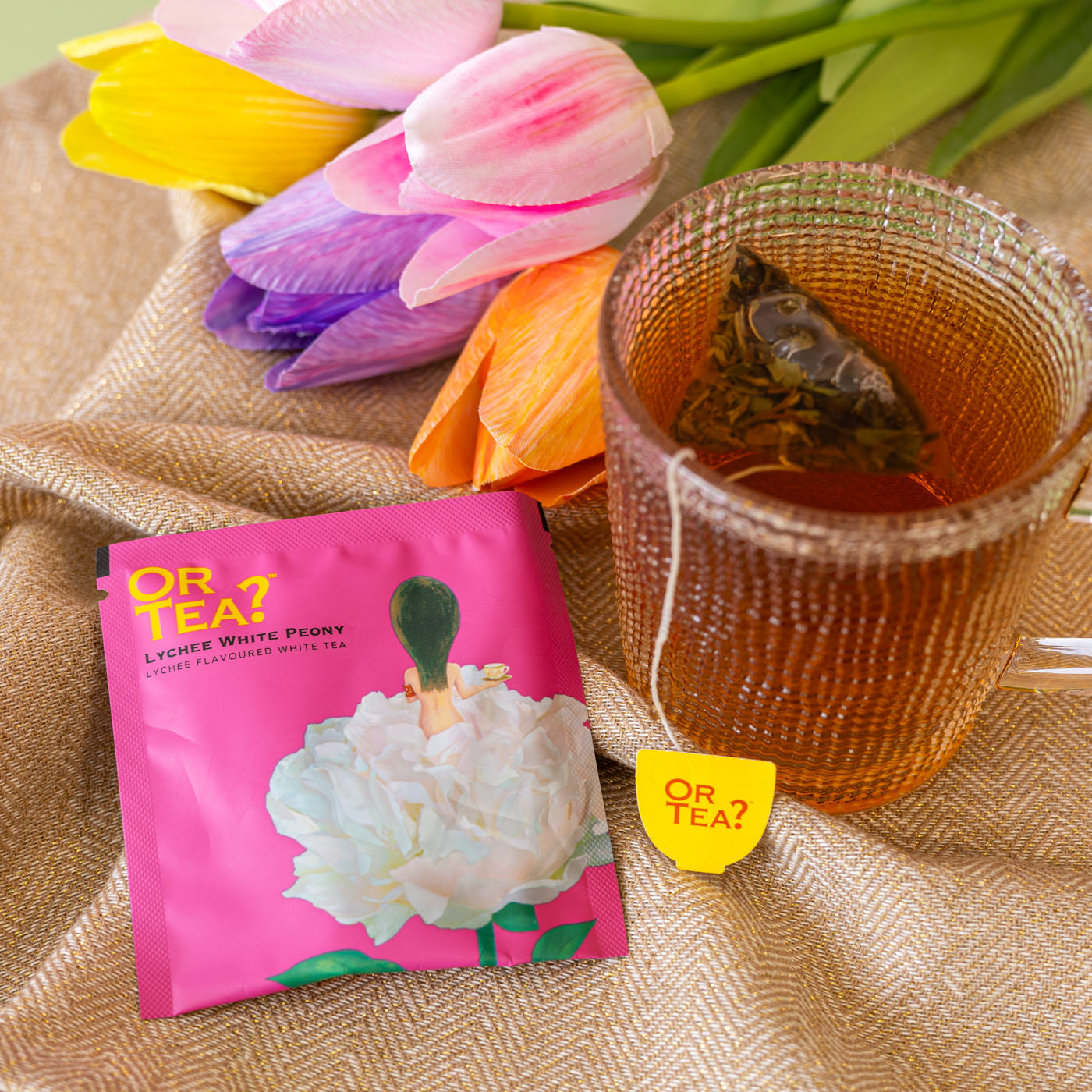 - Lychee White Peony de Or Tea (2 infusettes) : Thé blanc, pétales de rose, arôme litchi.