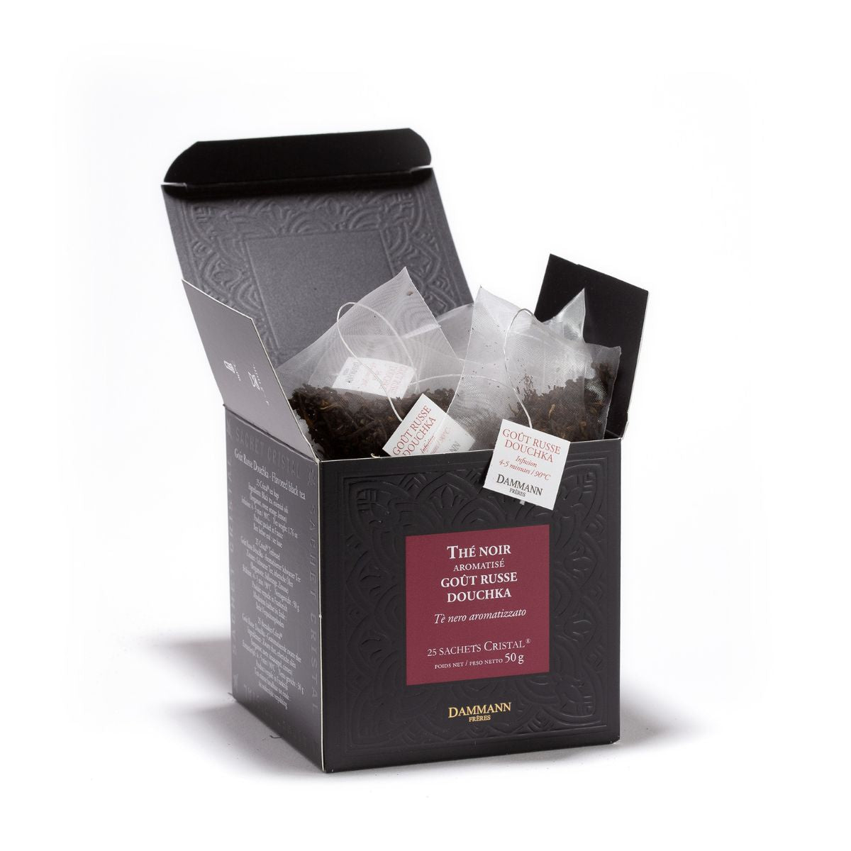 Recette phare crééé par Dammann Frères dans les années 1950, "Goût Russe Douchka" est un thé noir aromatisé aux huiles essentielles d’agrumes dont la composition est tenue secrète.