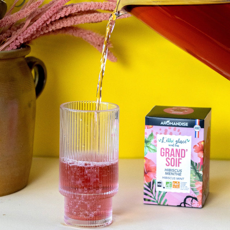 L'éthé glacé Grand soif' est une véritable source de fraîcheur et de vitalité. La force de l'hibiscus ajoutée à la fraîcheur de la menthe en font une boisson désaltérante parfaite pour la journée. Préparez-le la veille et dégustez-le dès le matin pour une sensation immédiate de bien-être et de fraîcheur. Pour un plaisir optimal, servez-le dans un grand verre rempli de glaçons.