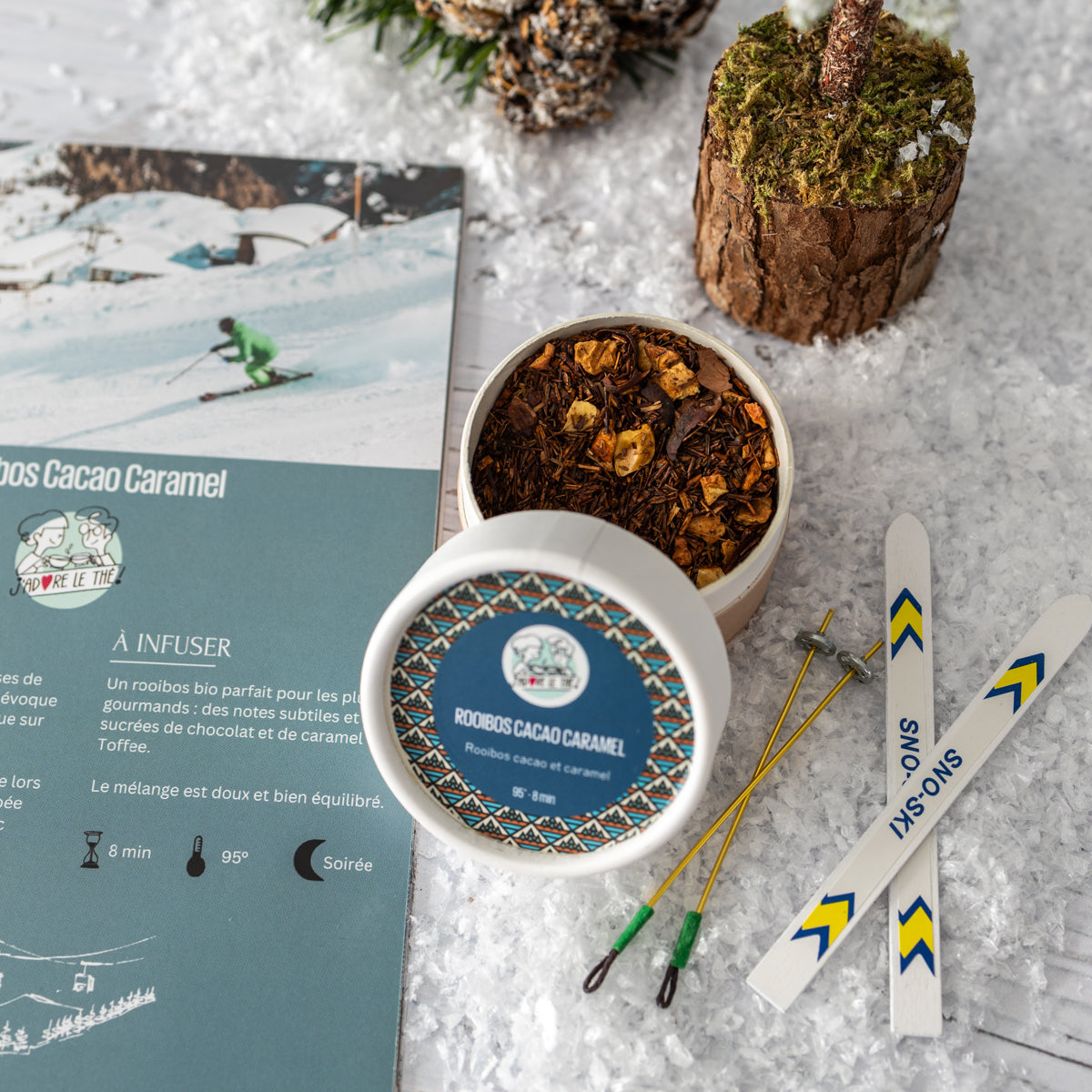 Présenté dans la box "Tout Schuss", ce rooibos se démarque par ses notes sucrées de chocolat et de caramel Toffee, créant un mélange doux et équilibré.