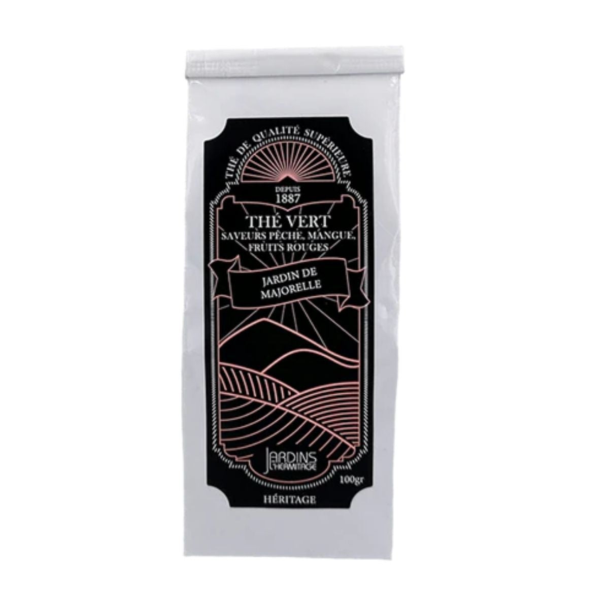Inspiré par l’atmosphère lumineuse et colorée du célèbre jardin marocain, Jardin de Majorelle de Jardins de l'Hermitage est un thé vert délicatement aromatisé aux saveurs ensoleillées.